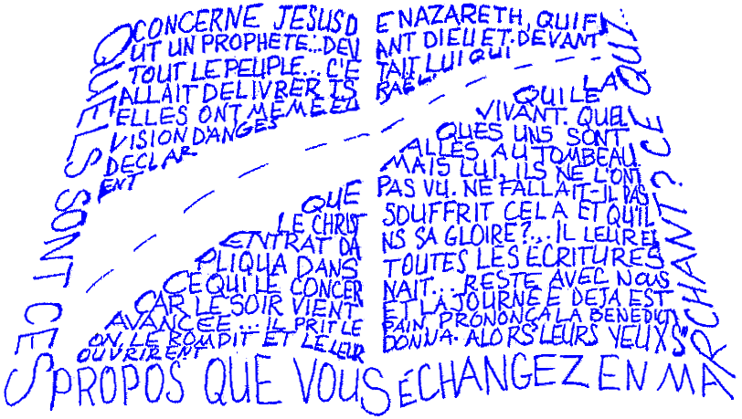 « Sur notre route... ta Parole ! » ![]() Les disciples d'Emmaüs Et voici que, ce même jour, deux d'entre eux se rendaient à un village du nom d'Emmaüs, à deux heures de marche de Jérusalem. Ils parlaient entre eux de tous ces événements. Or, comme ils parlaient et discutaient ensemble, Jésus lui-même les rejoignit et fit route avec eux; mais leurs yeux étaient empêchés de le reconnaître. Il leur dit: « Quels sont ces propos que vous échangez en marchant ? » Alors ils s'arrêtèrent, l'air sombre. L'un d'eux, nommé Cléopas, lui répondit: « Tu es bien le seul à séjourner à Jérusalem qui n'ait pas appris ce qui s'y est passé ces jours-ci ! » — « Quoi donc ? » leur dit-il. Ils lui répondirent: « Ce qui concerne Jésus de Nazareth, qui fut un prophète puissant en action et en parole devant Dieu et devant tout le peuple: comment nos grands prêtres et nos chefs l'ont livré pour être condamné à mort et l'ont crucifié; et nous, nous espérions qu'il était celui qui allait délivrer Israël. Mais, en plus de tout cela, voici le troisième jour que ces faits se sont passés. Toutefois, quelques femmes qui sont des nôtres nous ont bouleversés: s'étant rendues de grand matin au tombeau et n'ayant pas trouvé son corps, elles sont venues dire qu'elles ont même eu la vision d'anges qui le déclarent vivant. Quelques-uns de nos compagnons sont allés au tombeau et ce qu'ils ont trouvé était conforme à ce que les femmes avaient dit; mais lui, ils ne l'ont pas vu. » Et lui leur dit: « Esprits sans intelligence, coeurs lents à croire tout ce qu'ont déclaré les prophètes ! Ne fallait-il pas que le Christ souffrît cela et qu'il entrât dans sa gloire ? » et, commençant par Moïse et par tous les prophètes, il leur expliqua dans toutes les Écritures ce qui le concernait. Ils approchèrent du village où ils se rendaient, et lui fit mine d'aller plus loin. Ils le pressèrent en disant: « Reste avec nous car le soir vient et la journée déjà est avancée. » Et il entra pour rester avec eux. Or, quand il se fut mis à table avec eux, il prit le pain, prononça la bénédiction, le rompit et le leur donna. Alors leurs yeux s'ouvrirent et ils le reconnurent, puis il leur devint invisible. Et ils se dirent l'un à l'autre: « Notre coeur ne brûlait-il pas en nous tandis qu'il nous parlait en chemin et nous ouvrait les Écritures ? » À l'instant même, ils partirent et retournèrent à Jérusalem; ils trouvèrent réunis les Onze et leurs compagnons, qui leur dirent: « C'est bien vrai ! Le Seigneur est ressuscité, et il est apparu à Simon. » Et eux racontèrent ce qui s'était passé sur la route et comment ils l'avaient reconnu à la fraction du pain. Texte: Traduction Oecuménique de la Bible (TOB)