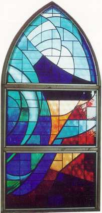 est centre ouest Genèse 1, 6-8 : "Dieu dit : "Qu'il y ait un firmament au milieu des eaux et qu'il sépare les eaux d'avec les eaux !" Dieu fit le firmament et il sépara les eaux inférieures au firmament d'avec les eaux supérieures. (...) Dieu appela le firmament "ciel". L'eau tourbillonne dans le ciel et remplit l'ogive de la fenêtre. À gauche du vitrail, se soulève une immense vague. Apparaît à droite le continent, prolongement de la gauche du vitrail central.