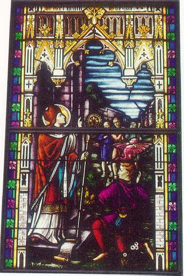 CATHÉDRALE SAINT-GERMAIN VERRIÈRE DE LA NEF EST - SECTION DU MILIEU (Aller au texte descriptif de cette verrière) La scène du milieu s'intitule: "Saint Germain délivre un possédé".