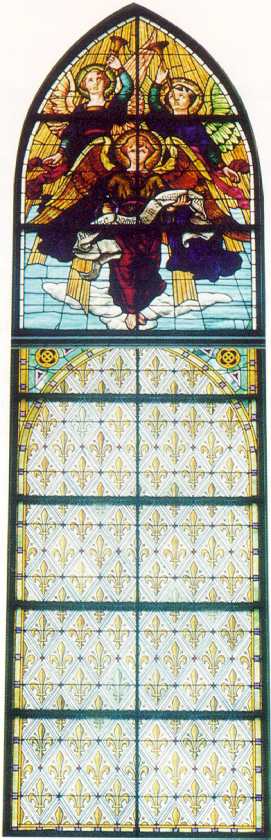 La section du haut nous présente trois séraphins dominant une nuée. Répondant à l'invitation du psaume 148, ils proclament les louanges du Seigneur. Ils sont irradiés par des traits de lumière jaillissant de la gloire de Dieu. À l'arrière-plan, surélevés, deux de ces anges font retentir l'éclat de leur trompette, le joues gonflées par l'effort, tandis qu'à l'avant-plan un troisième déploie une longue banderolle. On peut y lire l'inscription latine suivante : LAUDATE DOMINUM IN SANCTIS EJUS, ce qui se traduit: "Louez Dieu dans ses saints!". Tout le bas du vitrail représente un arc gothique serti de 116 fleurs de lys en or, un rappel de nos origines françaises.