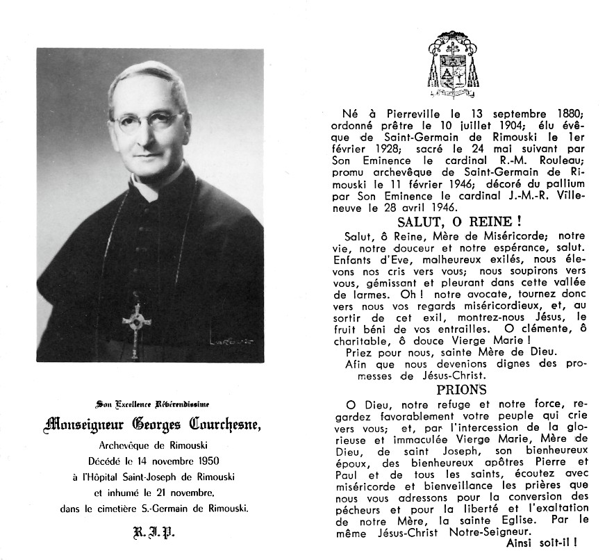 Né à Saint-Thomas-de-Pierreville, aujourd'hui Notre-Dame-de-Pierreville, le 13 septembre 1880, fils d'Alexandre Courchesne, cultivateur, et de Célina Bazin; ordonné prêtre pour le diocèse de Nicolet le 10 juillet 1904 en la chapelle du Séminaire de Nicolet par Mgr Hermann Brunault, évêque du lieu; ordonné évêque le 24 mai 1928 en la cathédrale de Rimouski par le cardinal Raymond-Marie Rouleau, archevêque de Québec, assisté de Mgr François-Xavier Ross, évêque de Gaspé, et de Mgr Joseph-Omer Plante, évêque auxiliaire de Québec; décédé le 14 novembre 1950 à l'Hôpital de Rimouski; funérailles en la cathédrale de Rimouski et inhumation dans le cimetière de Rimouski, le 21 novembre 1950. Image-souvenir Études classiques au Petit Séminaire de Nicolet (1892-1900); études théologiques au Grand Séminaire de Nicolet (1900-1904); détenteur d'un baccalauréat en théologie de l'Université Laval de Québec (1908); études à l'Angelicum de Rome (1908-1910), où il obtient un doctorat en théologie; études en pédagogie et en sociologie à l'Université francophone de Fribourg en Suisse (1910-1911). Georges Courchesne enseigne en Rhétorique au Séminaire de Nicolet pendant ses études théologiques de 1900 à 1904 et, après son ordination, de 1904 à 1908 et de 1911 à 1917. De 1917 à 1919, il est en repos aux États-Unis : d'abord à Bourbonnais (Illinois), en 1917-1918, puis à Manchester (New Hampshire) en 1918-1919. Il devient principal de l'École normale de Nicolet de 1919 à 1928 et, en même temps, professeur de pédagogie à l'École normale supérieure de l'Université Laval de 1920 à 1927. Il est créé chanoine honoraire du chapitre cathédral de Nicolet en 1923. Durant cette période, il est aussi membre de l'officialité diocésaine, à titre de vice-chancelier, de 1913 à 1923, de vice-notaire, de 1923 à 1926, de chancelier et de notaire, de 1926 à 1928. Élu quatrième évêque de Rimouski le 1er février 1928, il prend possession de son siège le 25 mars 1928 à l'évêché de Rimouski. Le 11 mars 1944, il reçoit un auxiliaire en la personne de Mgr Charles-Eugène Parent. Pendant son épiscopat, le diocèse de Rimouski est élevé au rang d'archidiocèse métropolitain le 9 février 1946. Les diocèses de Gaspé, du Golfe Saint-Laurent (aujourd'hui Baie-Comeau) et le vicariat apostolique du Labrador deviennent alors ses suffragants, lesquels forment avec ledit archidiocèse une nouvelle province ecclésiastique. Devenu le même jour le premier archevêque métropolitain de Rimouski, le Saint-Siège lui confère le pallium le 18 février suivant. En la cathédrale de Rimouski, le 28 avril 1946, Georges Courchesne reçoit l'insigne de cette dignité des mains du cardinal Jean-Marie-Rodrigue Villeneuve, archevêque de Québec. Georges Courchesne fait de l'éducation de son peuple le pivot de son action épiscopale. Lui-même agit comme principal de l'École normale des Ursulines de Rimouski de 1929 à 1948 et il se révèle un maître à penser dans ses nombreuses lettres pastorales et circulaires, sa prédication (même à la radio), ses conférences, ses interventions publiques de tous ordres. Il favorise la création de quatre écoles normales de filles : Sainte-Rose-du-Dégelé en 1940, Mont-Joli en 1942, Amqui et Matane en 1948; de quatre écoles ménagères régionales : Mont-Joli en 1930 (déménagée à Rimouski en 1941), Estcourt en 1941, Trois-Pistoles en 1945, Matane en 1950; de deux centres d'initiation artisanale : Cabano en 1941, Matane en 1943; d'une école moyenne d'agriculture et artisanale à Sully en 1929 et d'une école d'infirmières à Rimouski en 1946. En même temps, il consolide le Séminaire de Rimouski en contribuant personnellement à diminuer sa dette et en lui rattachant de nouvelles institutions : l'École d'arts et métiers en 1936 (devenue l'École technique en 1948), le Grand Séminaire de Rimouski qui reçoit de nouveaux locaux en 1943, l'École de marine en 1944, l'École de commerce en 1945. Pour l'éducation comme pour les oeuvres sociales et paroissiales, il fait appel à de nouvelles communautés d'hommes, qui passent de cinq à 10, et de femmes, qui passent de neuf à 15. Les Rédemptoristes s'établissent à Estcourt en 1929, les Clercs de Saint-Viateur à Sully en 1930, les Spiritains à Lac-au-Saumon en 1941, de retour au diocèse, les Capucins s'installent à Cacouna en 1942 et les Frères de l'Instruction chrétienne à Sayabec en 1943. À Lac-au-Saumon, la communauté diocésaine des Servantes de Notre-Dame, Reine du Clergé, est fondée avec son accord en 1929. L'arrivée d'autres communautés féminines est également à signaler. Les Dominicaines de l'Enfant-Jésus de Québec arrivent à Matane en 1935, les Filles de la Sagesse à Mont-Joli en 1939, les Sœurs de Saint-Joseph de Saint-Vallier à Estcourt en 1940, la Société des Filles du Cœur de Marie à Rimouski en 1942, les Sœurs de l'Enfant-Jésus à Saint-Éloi en 1948. Deux de ces communautés contribue activement à l'ouverture d'un hôpital à Matane en 1935 et d'un sanatorium à Mont-Joli en 1939. Sur le plan des œuvres sociales, signalons enfin son appui à la mise place du Secrétariat social de l'Enfance de Rimouski en 1950. Ruraliste convaincu, Georges Courchesne se porte à la défense et au relèvement de la classe agricole par son appui indéfectible à l'Union catholique des cultivateurs et à l'Union catholique des fermières, mais aussi par ses interventions auprès des hommes politiques, la dénonciation des abus – des compagnies forestières, par exemple –, la promotion de la colonisation. Dans ce but, il préside un congrès de colonisation à Rimouski en 1929, réveille la Société diocésaine de colonisation fondée en 1919, accueille à deux reprises les Semaines sociales du Canada à Rimouski pour débattre du problème de la terre (1933) et de la vie rurale (1947), tout en contribuant à l'ouverture plusieurs