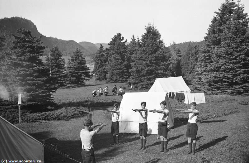 1934-07-24_16 23-31 juillet 1934. Camp scout à l'île aux Amours (Bic). Gymnastique matinale. |