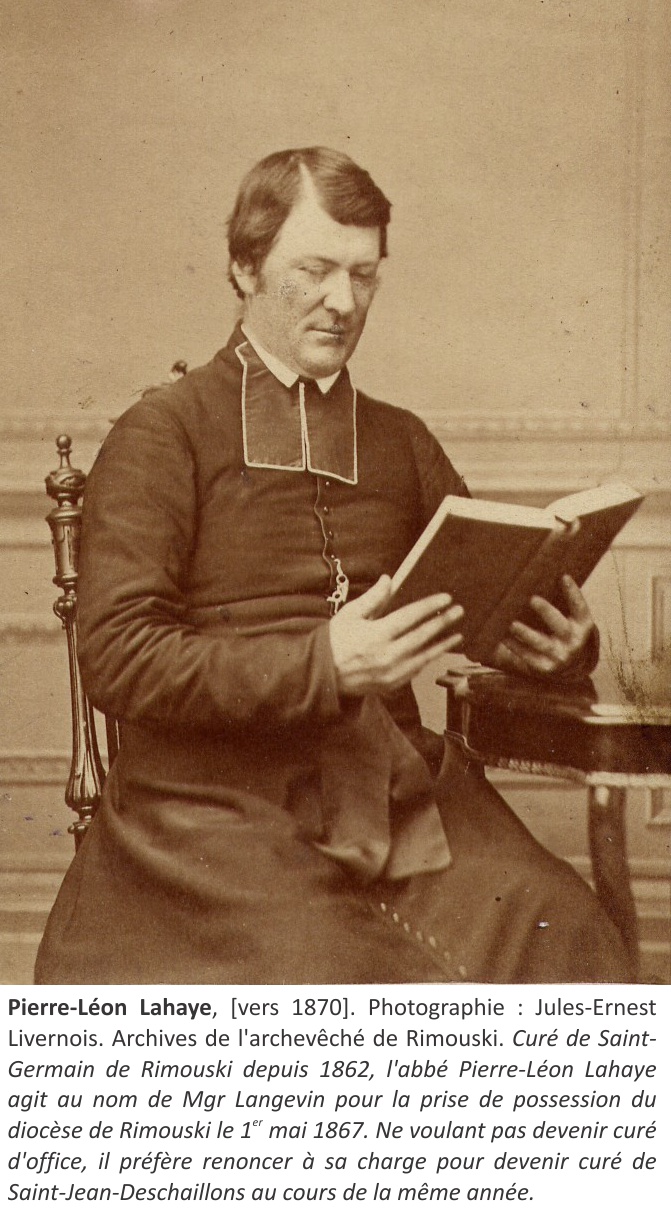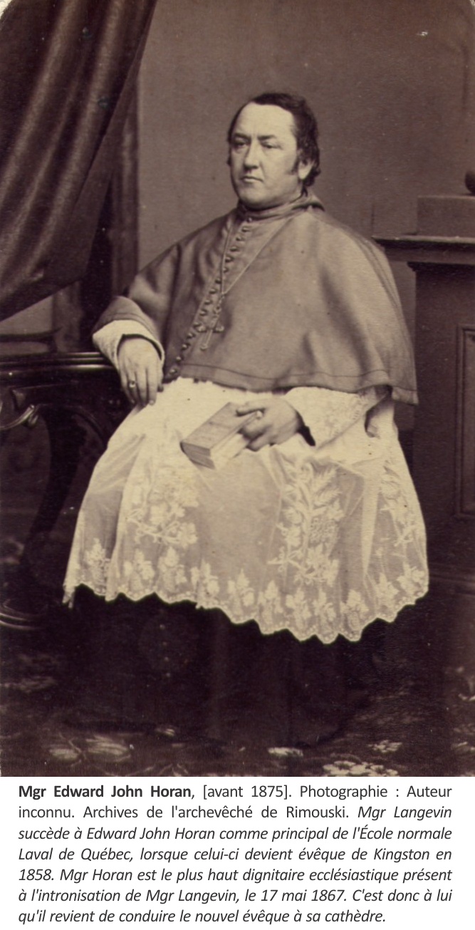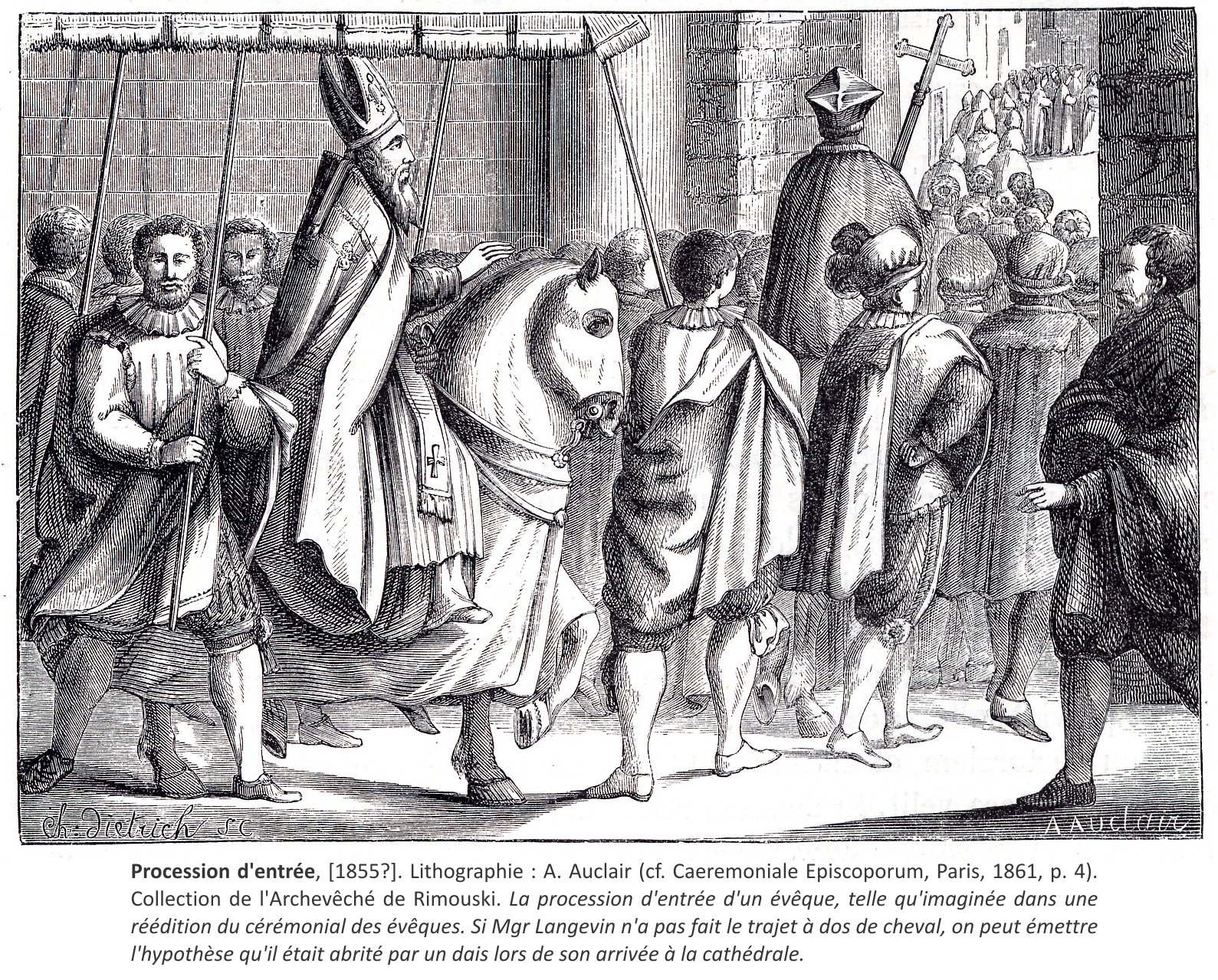 [...] le premier acte de Monseigneur Langevin, en mettant le pied dans le vestibule de sa cathédrale, fut de s’agenouiller sur le seuil de la porte principale, pour exprimer officiellement et sacerdotalement son entrée dans le diocèse de St-Germain de Rimouski. Là, le curé de la paroisse, M. l’abbé [Pierre-Léon] Lahaye, lui présenta le crucifix à baiser, et, lecture ayant été donnée de la bulle du Souverain Pontife érigeant cette portion du diocèse de Québec en évêché et en confiant la direction à la vigilance du nouveau pasteur, Monseigneur, accompagné de l’Évêque de Kingston, reçut l’eau bénite et l’encens, et fit son entrée triomphale, annoncée par les sublimes accords du Te Deum, bénissant solennellement son peuple et entouré de son chapitre et de son clergé. Arrivé au pied de l’autel, il s’y agenouilla pour y faire une seconde prière, puis, l’ayant embrassé respectueusement, il fut conduit à son trône épiscopal par Sa Grandeur Monseigneur [Edward John] Horan, et là, comme dit naïvement l’acte notarié de prise de possession, « personne ne s’y étant opposé, [il fut] reconnu joyeusement pour père en Dieu et évêque de St-Germain de Rimouski, par le baiser de la main », que les prêtres s’en vinrent lui donner deux par deux (Charles Guay, Chronique de Rimouski, Québec, P.-G. Delisle, 1873, p. 209-210).