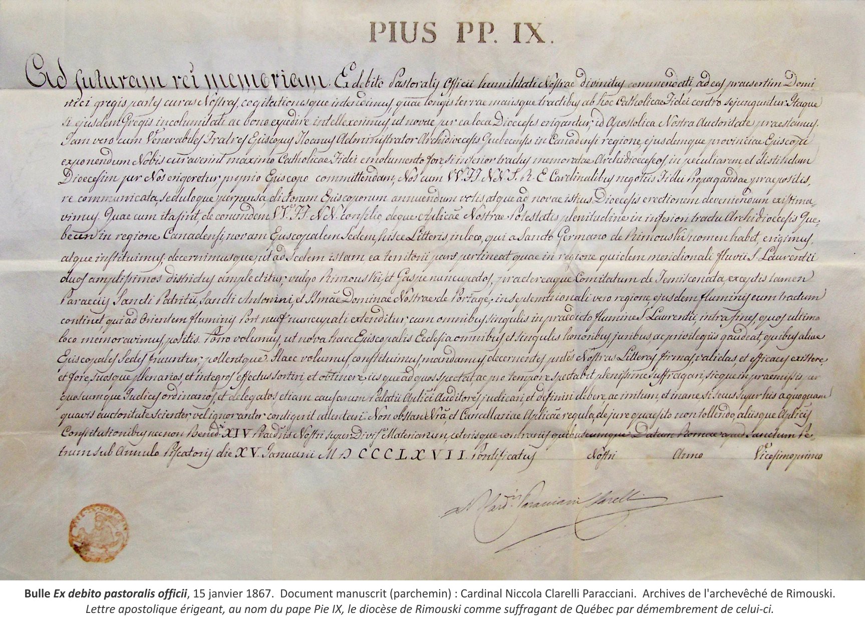 L’année 2017 marque le 150e anniversaire de fondation du diocèse de Rimouski. C’est en effet le 15 janvier 1867 que le bienheureux pape Pie IX délivre les bulles apostoliques qui annoncent la création du diocèse de Rimouski par démembrement de l’archidiocèse de Québec et la nomination de son premier évêque, Mgr Jean Langevin, alors principal de l’école normale Laval de Québec. Cette décision s’inscrit dans un contexte d’expansion du catholicisme en Amérique du Nord, Rimouski devenant alors la 18e circonscription ecclésiastique à se former en terre canadienne et la 54e à s’établir dans les limites du territoire jadis confié à saint François de Montmorency-Laval, premier évêque du diocèse de Québec. Constitué d’un démembrement de celui-ci, le nouveau diocèse comprend les districts de Rimouski et de Gaspé, le comté de Témiscouata – moins les paroisses de Rivière-du-Loup, de Notre-Dame-du-Portage et de Saint-Antonin – et, sur la Côte-Nord, tout le territoire compris entre la rivière Portneuf et l’anse de Blanc-Sablon. La bulle pontificale créant le nouveau diocèse est promulguée par une lettre pastorale de l’administrateur apostolique de Québec, le 11 avril 1867.