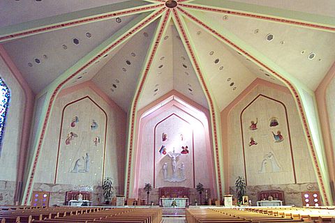 Les trois arcs du choeur représentent les Mystères du Rosaire. À gauche, les Mystère joyeux, la Nativité de Jésus étant mise en relief. Au centre, les Mystères douloureux, la Crucifixion étant en évidence. À droite, les Mystères glorieux, l'accent portant sur le couronnement de Marie. L'ensemble des arcs donne l'impression d'un immense diadème, le diadème de Marie. La forme décagonale rappelle le chiffre des dizaines; des grains de chapelets courent se rencontrer sous la clef de voûte où ils sont réunis par une églantine dorée de grande dimension. Cette fleur symbolique fait partout le thème du décor.