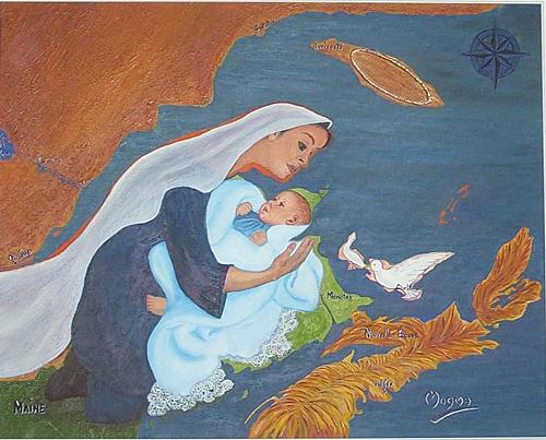 Oeuvre originale de l'artiste Magma (Marie-Anne-Ghislaine Michaud-Arsenault, 2008) intitulée Notre-Dame d'Acadie, elle fait partie d'une exposition à la Galerie Restigouche du 19 juin au 15 août 2008. Puis elle sera exposée en permanence à l'église Notre-Dame-de-la-Garde de Pointe-à-la-Garde. C'est une toile de 60 x 90 cm, réalisée en médium mixte, huile sur acrylique avec détail en poudre d'or. Un mot d'histoire : l'Acadie d'avant 1755 était nichée autour de Grand-Pré, au fond de la Baie Française (Baie de Fundy), en Nouvelle-Écosse. Lors du Grand Dérangement de la Déportation ordonné par Lawrence, plusieurs ressortissants fuyant l'oppresseur se sont retrouvés à l'Île St-Jean (maintenant l'Île-du-Prince-Édouard), puis ont remonté les rivières Peticodiac, St-Jean et la Baie des Chaleurs qu'ils ont traversée pour se mettre à l'abri. Le relief de l'est du Canada suggère des formes qui couvrent ce territoire mal délimité qu'est l'Acadie. Une fois extirpée de sa gangue géographique, on peut imaginer les personnages suivants : une madone agenouillée dont le profil se découvre sur la péninsule gaspésienne avec son auréole sur l'Île Anticosti, escortée d'une colombe profilée sur l'Île-du-Prince-Édouard. Puisque nous recevons les premiers rayons du jour à l'est, elle vient de lever, d'une couchette garnie de paille qu'est la Nouvelle-Écosse, son Enfant bien éveillé, tracé sur la Péninsule acadienne. Son voile couvrant tout le sud du Fleuve Saint-Laurent remonte jusqu'à Québec et sa robe couvre une partie des Cantons de l'Est jusqu'au sud du Nouveau-Brunswick et du Maine (É-U) où demeurent toujours des Acadiens de sang et de coeur. © 2008, Ghislaine M. Arsenault. Tous droits réservés. __________________________________________________________ |