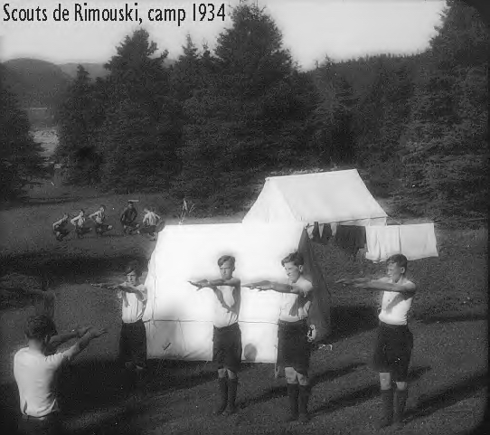 ![]() 10. Scouts de Rimouski. Premier camp d'été, à l'Île-aux-Amours, du 22 au 31 juillet 1934. Gymnastique matinale. |