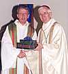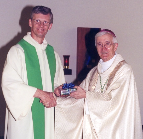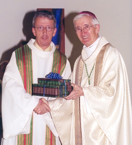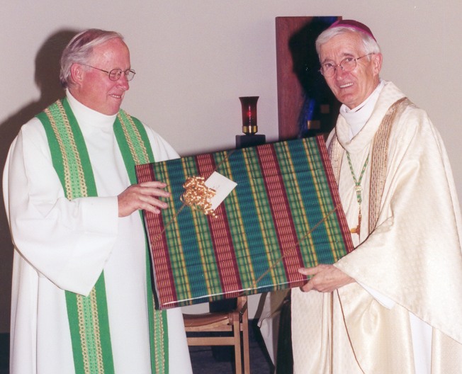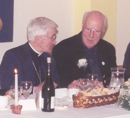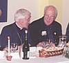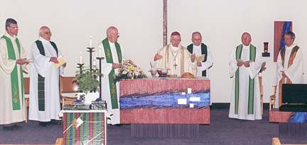 Archidiocèse de Rimouski SIGNES DU CHRIST DANS UN PEUPLE PÈLERINC’est sous ce thème que s’est déroulée, les 10 et 11 juin 2003, la 26e Assemblée des prêtres du diocèse de Rimouski. La majorité des prêtres du diocèse se sont réunis à la Grande Maison de Sainte-Luce pour un temps d’échange et de prière qui a culminé lors d'une célébration eucharistique et d'un banquet où quelques prêtres jubilaires ont été honorés. Les jubilaires : Cinq prêtres célébraient des anniversaires d’ordination. Voici les jubilaires présents (de gauche à droite) : Jocelyn Malenfant et Benoît Caron (25 ans d'ordination sacerdotale); Maurice Gagnon (50 ans d'ordination sacerdotale); Mgr Bertrand Blanchet. Philibert Dionne et Jean-Louis Smith (40 ans d'ordination sacerdotale). Gérald Roy, vicaire général. (Cliquez sur l'une ou l'autre image pour son agrandissement.)
