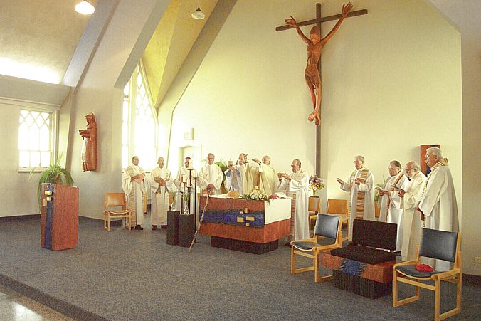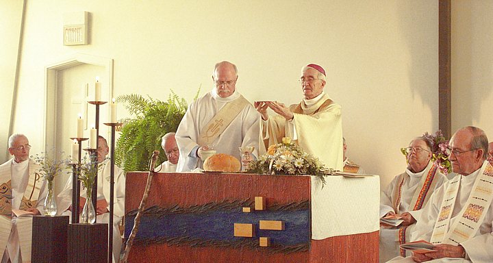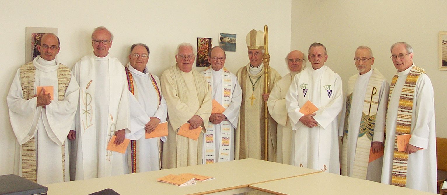 ÉVANGÉLISER AUJOURD'HUI... MISSION IMPOSSIBLE ?C’est sous ce thème que s’est déroulée, les 15 et 16 juin 2004, la 27e Assemblée des prêtres du diocèse de Rimouski. Les participant ont unanimement répondu: Évangéliser aujourd'hui, c'est toujours possible ! C'est ainsi que la majorité des prêtres du diocèse se sont réunis à la Grande Maison de Sainte-Luce pour un temps d’échange et de prière qui s’est terminé par une célébration eucharistique et un banquet où plusieurs jubilaires ont été honorés. Les jubilaires : Huit prêtres célébraient des anniversaires d’ordination. Voici les jubilaires présents (de gauche à droite) : Gilbert Dubé (25 ans d'ordination sacerdotale); Jean-Guy Nadeau, Nive Voisine et Jean Drapeau (50 ans d'ordination sacerdotale); Jules-Édouard Pilotte (65 ans d'ordination sacerdotale). Mgr Bertrand Blanchet. Jacques Tremblay, Gérald Tardif et Claude Heppel (40 ans d'ordination sacerdotale). Gérald Roy, vicaire général.