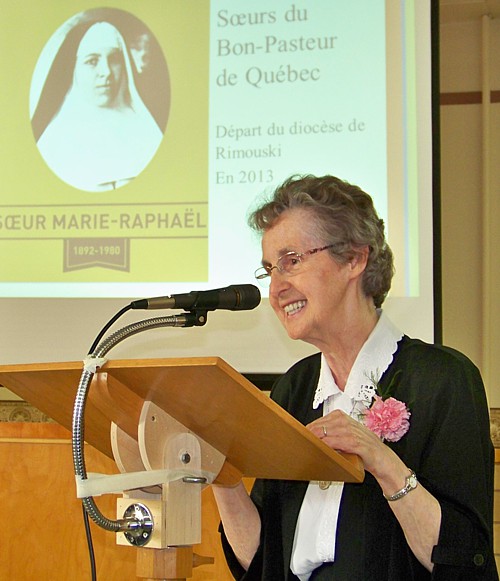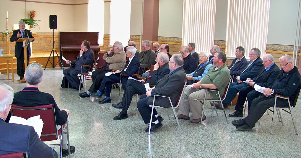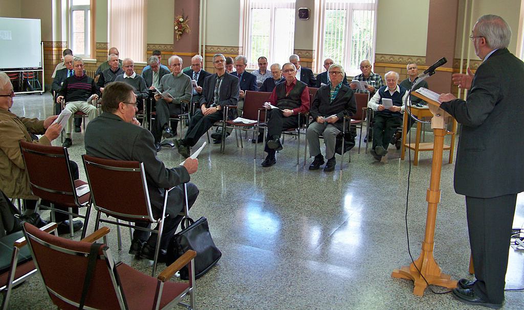 C'est sous ce thème que s'est déroulée, le 4 juin 2013, la 36e Assemblée annuelle des prêtres au Grand Séminaire de Rimouski. L'avant-midi fut principalement consacrée à plusieurs témoignages interpellants sur la foi et la joie chrétienne, suivis de réactions en ateliers et d'une enrichissante plénière. Cette rencontre, qui regroupait une cinquantaine de prêtres, a aussi été l'occasion de célébrer, en après-midi, le jubilé sacerdotal de huit d'entre eux. Les jubilaires présents ont bien voulu témoigner de la manière dont ils ont vécu leur foi et sont demeurés dans la joie par leur ministère sacerdotal. Le tout fut suivi d'une célébration eucharistique à la chapelle du Grand Séminaire et d'un banquet pour les prêtres jubilaires. Résumé de la journée par Mgr Fournier :La joie de croire Croire que l’humanité n’est pas un « bateau ivre » (Nelligan) qui dérive déboussolé vers des rives sans nom est pour moi une source d’espérance qui s’apparente à la joie. Chaque année, au mois de juin, tous les prêtres du diocèse de Rimouski sont invités à une grande journée de ressourcement et de fraternité. À l’occasion de cette Année de la foi, le thème était « Foi et Joie ». Dans un Québec qui est aujourd’hui une terre de mission, le prêtre trouve son bonheur à servir ses frères et sœurs assoiffés de lumière et de justice malgré les obstacles qui surgissent de toutes parts. Des serviteurs jubilaires En après-midi, nous avons célébré nos vaillants jubilaires. Tout d’abord les 40 ans d’épiscopat de Mgr Bertrand Blanchet, mon prédécesseur : il demeure au Collège de Sainte-Anne-de-la-Pocatière et continue à donner des conférences et des retraites. Nous avons également souligné sept anniversaires d’ordination presbytérale. Émile Gauvin (65 ans) : il vit à Saint-Épiphane dans une maison de retraite. Paul Lavoie, prêtre des Missions-Étrangères (60 ans) : il est retiré dans la maison de sa communauté à Pont-Viau. Philibert Dionne dit le « vieux Phil » (50 ans) : il demeure au grand séminaire à Rimouski. Jean-Louis Smith (50 ans) : demeurant à Trois-Pistoles, il continue à rendre de précieux services dans les paroisses environnantes. Victorien Levesque (40 ans) : il est en service pastoral à Montréal. Hermel Lahey (40 ans) : grâce à son initiative et à celle du milieu, une bibliothèque municipale vient d’être inaugurée à l’arrière de l’église Saint-Jean-de-Dieu. Grégoire Vignola, prêtre des Missions-Étrangères (40 ans) : il est missionnaire à Hong Kong. Nous avons aussi fait mention des 50 ans de vie religieuse de sœur Gisèle Chouinard, servante de Notre-Dame, Reine du Clergé. Responsable de l’accompagnement des prêtres retraités du diocèse, la maladie l’oblige à quitter cette fonction qu’elle remplissait si bien. Départs Nous avons pris le temps de remercier deux prêtres qui quittent cette année le ministère actif : l’abbé Gérard Beaulieu qui, à 77 ans, est présentement le plus vieux curé en exercice (Price, Padoue, Saint-Octave et Métis-sur-mer); l’abbé Béatrix Morin, bientôt 68 ans, curé des paroisses du secteur des Érables et demeurant à Saint-Hubert. En présence de quelques membres de la communauté des Sœurs du Bon-Pasteur, dont l’implantation à Matane remonte à 1883, nous avons souligné la qualité des œuvres sociales et d’enseignement de cet institut dans notre diocèse. Elles doivent nous quitter, mais les liens de solidarité et de prière demeurent. Paix et Joie ! + Pierre-André Fournier L'assemblée (a.m.)
