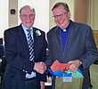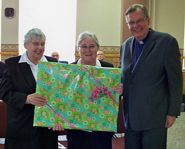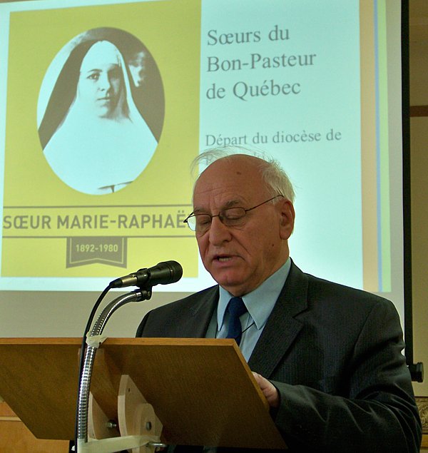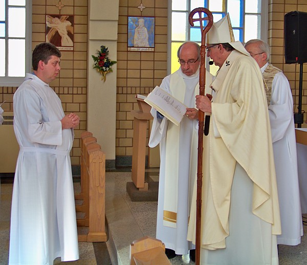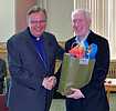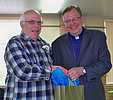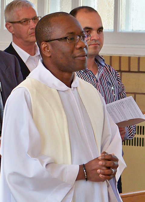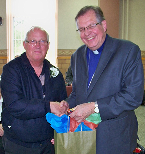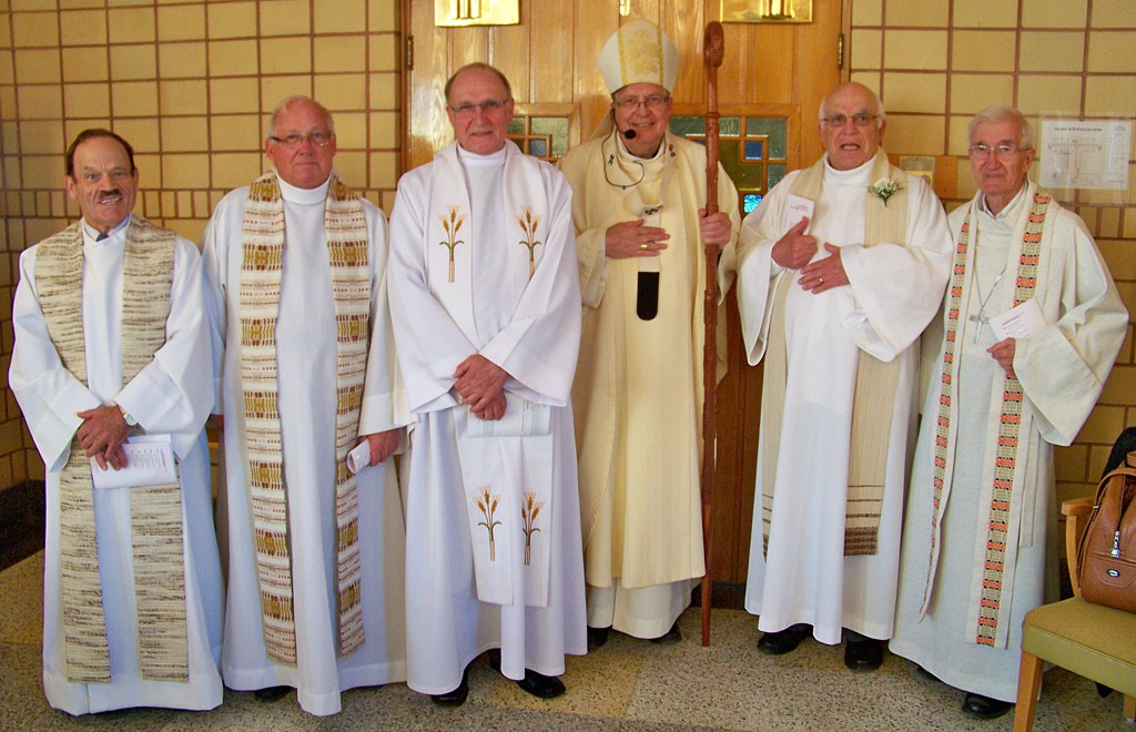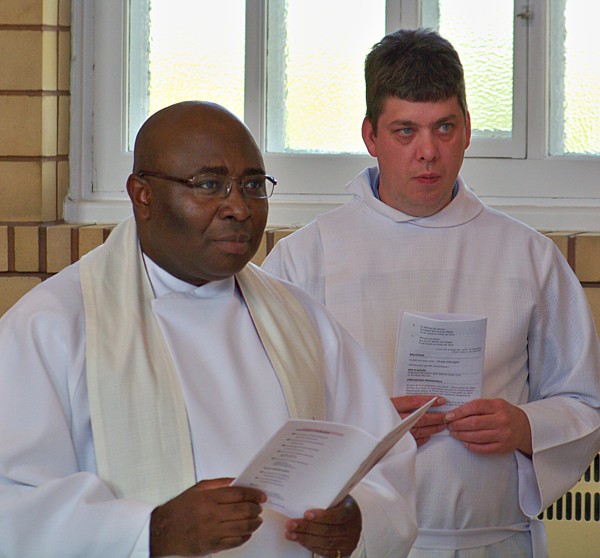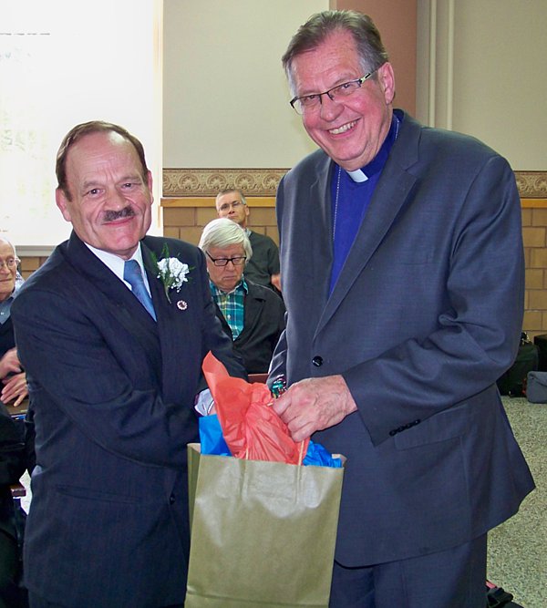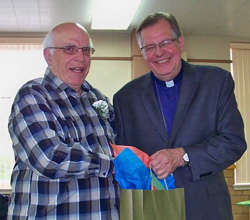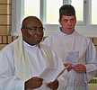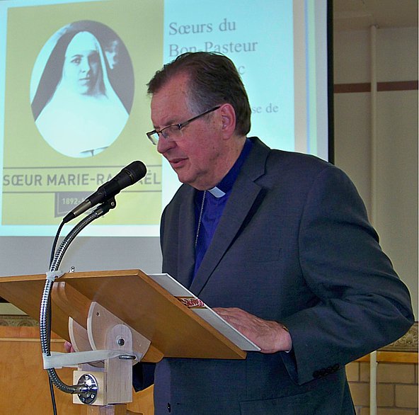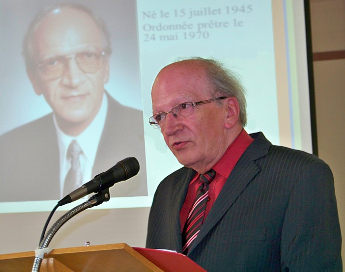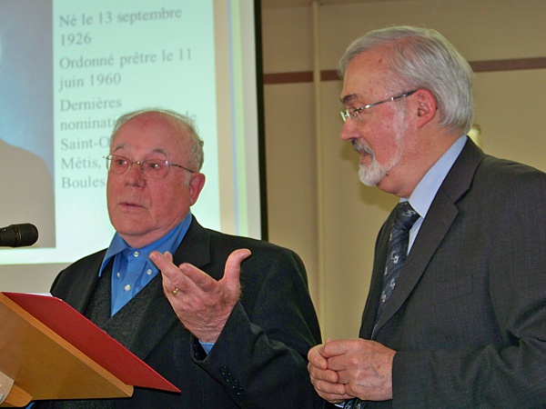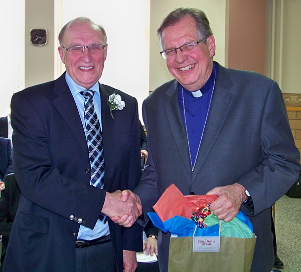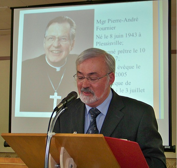 Autres hommages :La célébration eucharistique (p.m.)La célébration eucharistique a été l'occasion d'accueillir deux prêtres qui viennent rendre service au diocèse : les abbés Alain-Patrick David, c.j.m. (pour les paroisses du secteur de Sayabec) et Boniface Mouelé (pour les paroisses du secteur de Saint-Hubert). Mgr Fournier a également accueilli un candidat au sacerdoce : M. Stéphane Bouchard. Le repas de fête (soir)