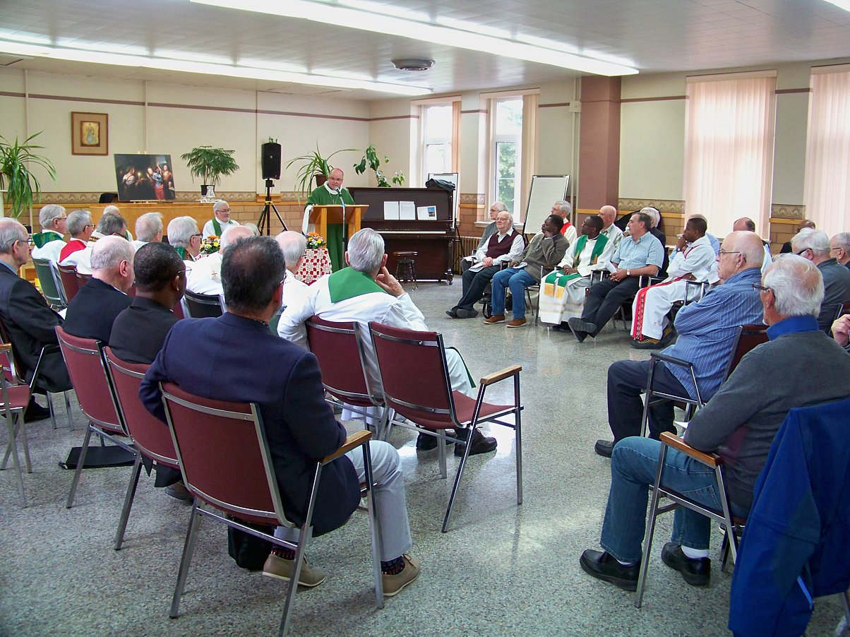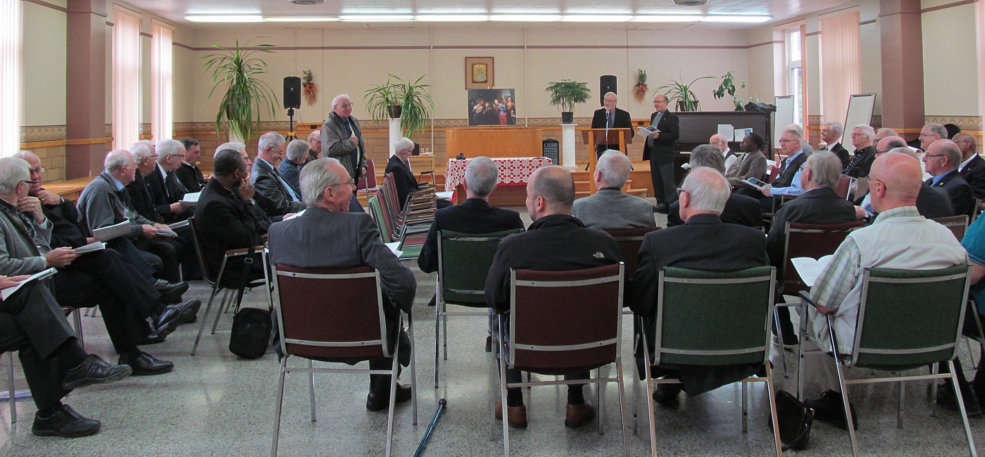 C'est sous le thème de Joies et peines que la 41e Assemblée annuelle des prêtres s'est tenue le 5 juin 2018, au Grand Séminaire de Rimouski. Cette rencontre, qui regroupait plus de 50 prêtres, fut l'occasion de célébrer le jubilé sacerdotal de treize d'entre eux. En début de rencontre, en petites équipes puis en plénière, les participants se sont posés les questiosn suivantes : 1. Quelles sont mes plus grandes peines et inquiétudes ? 2. Quelles sont mes plus grandes sources de joie et d’espérance ? 3. Quelle est la Parole de Dieu qui s’impose à moi à la suite de cet échange ? Il fut suivi de la célébrations eucharistique présidée par Mgr Denis Grondin, puis du dîner qui a été l'occasion de fêter les jubilaires et de souligner quelques départs à la retraite